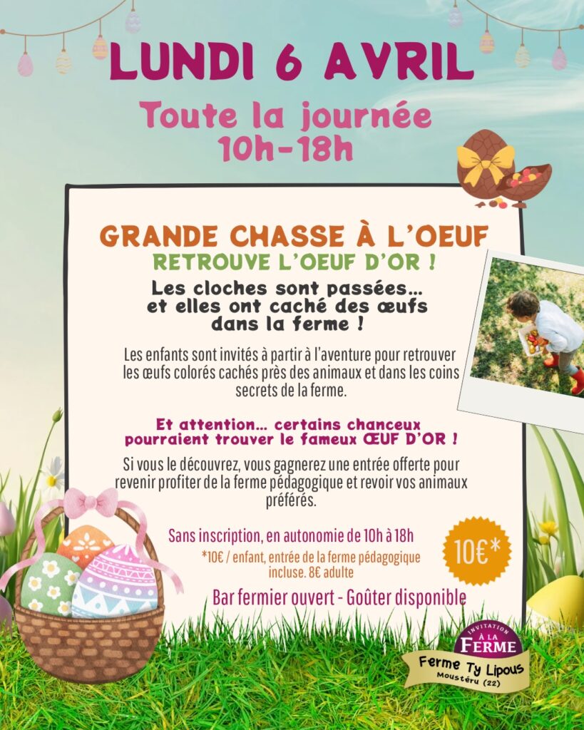 Le lundi 6 avril, préparez-vous pour une aventure inoubliable à la ferme pédagogique Ty Lipous ! Les cloches de Pâques sont passées et ont déposé leurs oeufs colorés près des animaux et dans les coins secrets de la ferme. Et si vous retrouvez l’oeuf d’or, vous gagnerez une entrée gratuite pour revenir visiter la ferme pédagogique !