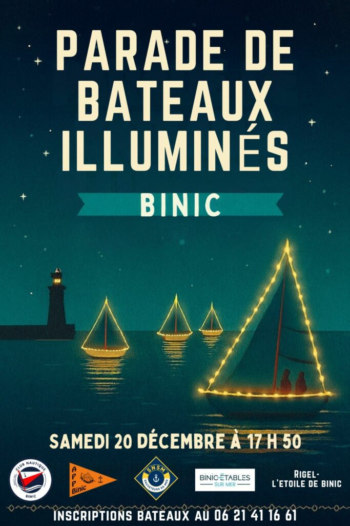 La traditionnelle parade de bateaux illuminés a lieu samedi 20 décembre 2025 à 17h50 sur le port de Binic.