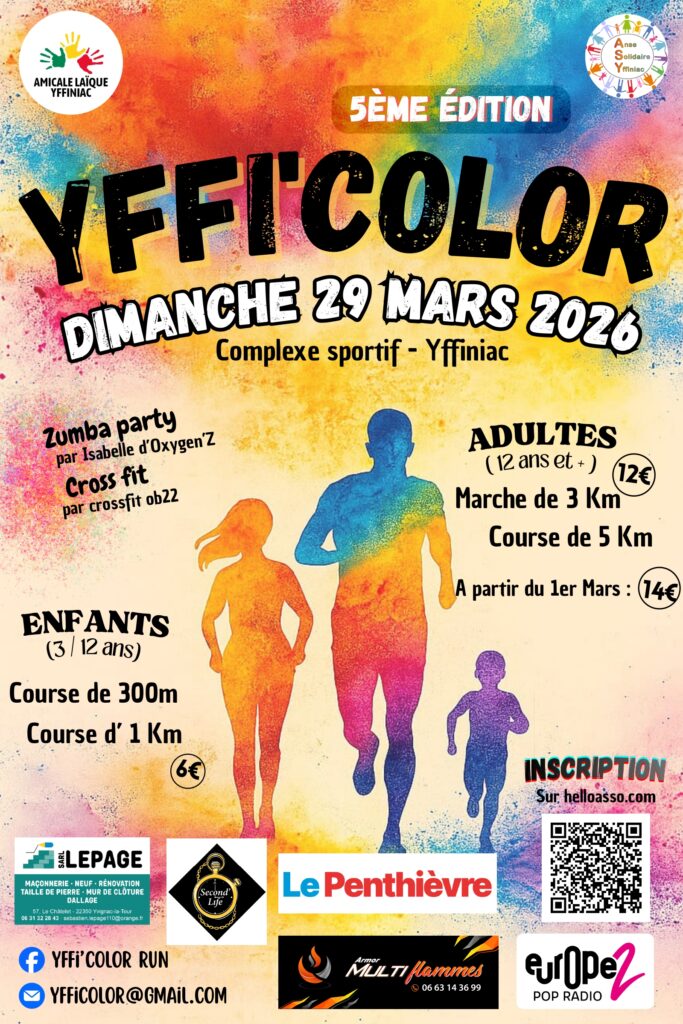 Cinquième édition de l’Yffi’Color, le dimanche 29 mars 2026 au complexe sportif d’Yffiniac à partir de 9h30, organisée par l’amicale laïque d’Yffiniac